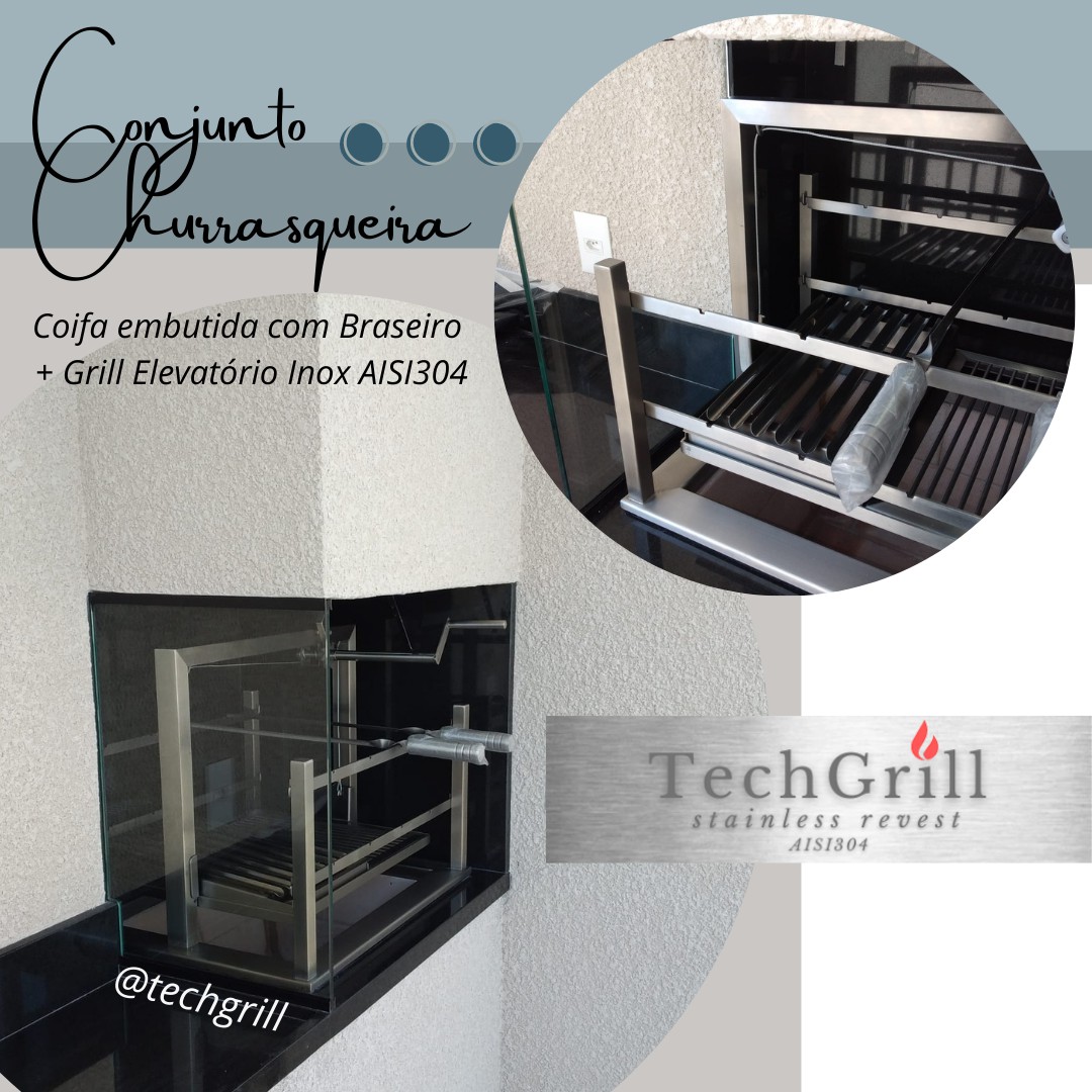 Churrasqueira com BRAZEIRO (padrão ou sob medida) revestido com tijolos refrátarios, caixa e moldura INOX 304 - Coifa Inox suspensa - SOB MEDIDA.